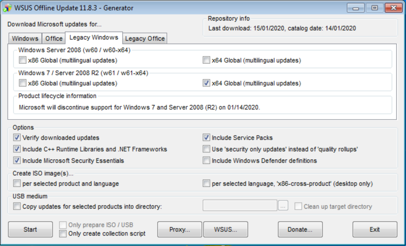 Un bien bel outil que WSUS Offline Update, qui permet de préparer des « packs de déploiement de mises à jour » personnalisés pour les environnements Microsoft. J’ai ainsi pu préparer un « service pack » pour Windows 7 afin de palier la fin du support de l’OS par Microsoft.