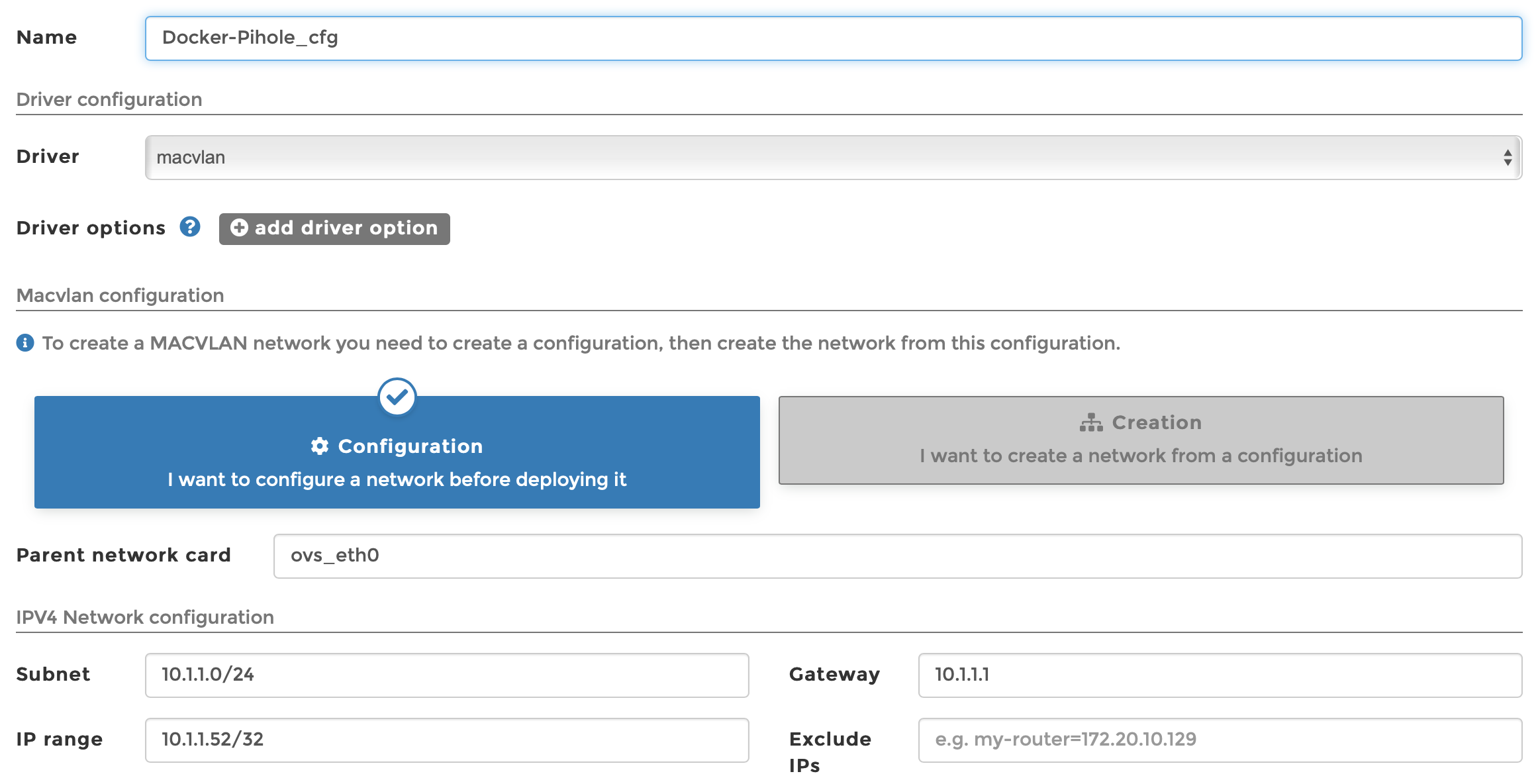Docker intègre un autre mode d’interconnexion réseau, un driver appelé macvlan : en pratique, il s’agit plus ou moins d’un virtual switch qu’on trouve sur les principales solutions de VM : on crée des réseaux virtuels adossés à une interface physique, et les machines associées disposent alors d’une stack IP complète. Attention, cependant : le nom macvlan semble impliquer qu’on crée un VLAN entier (donc avec subnet et passerelle associées), mais c’est faux. En réalité, il s’agit plus d’un sous-réseau du LAN physique qui vient se greffer à ce dernier. Ici, on crée donc un subnet à host unique 10.1.1.52/32, qui sera également l’adresse IP du conteneur Pi-hole.
