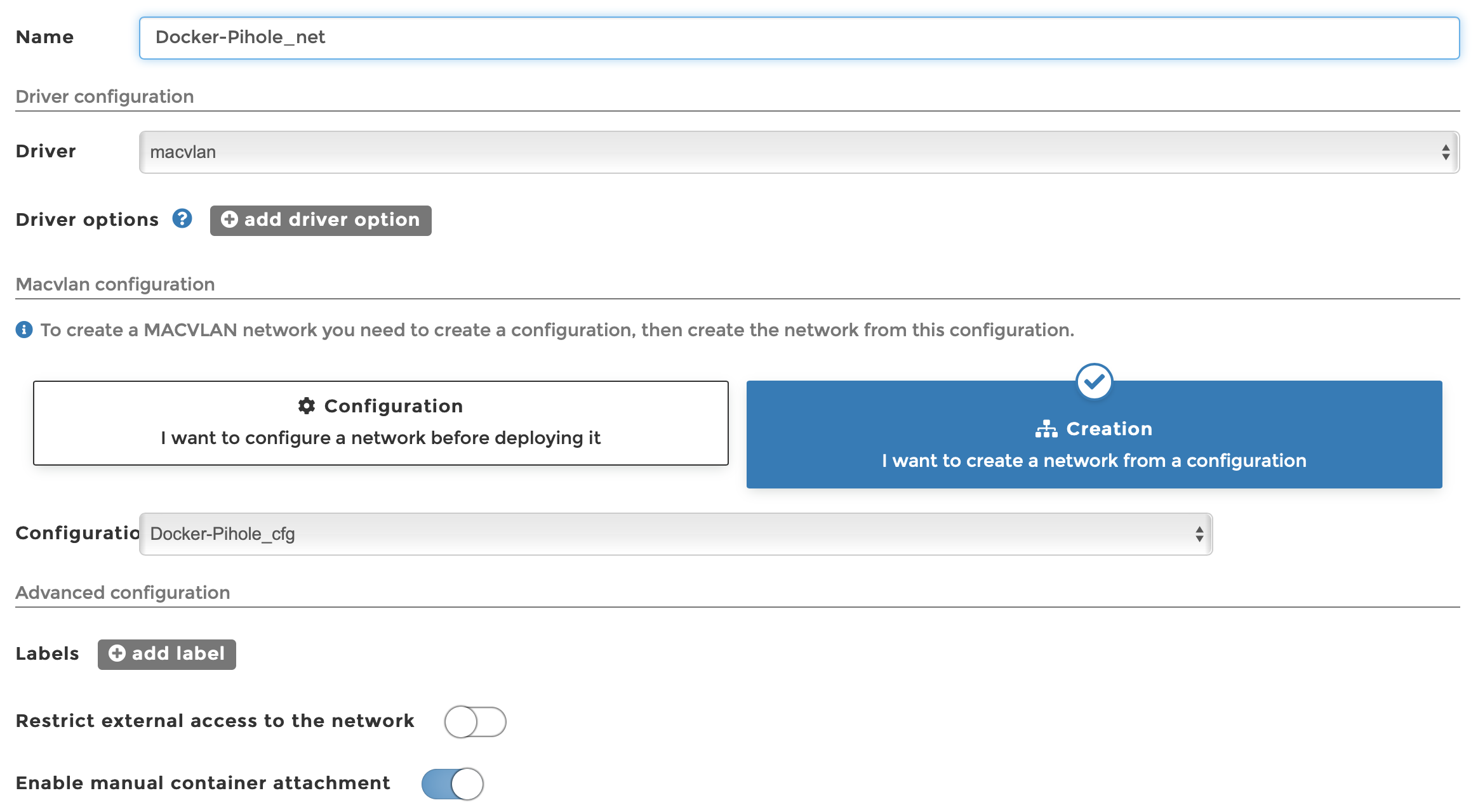 - Créer une instance du réseau : pas de paramètre particulier ici, il suffit de choisir la configuration précédemment créée dans le menu (attention : bien cocher l’option Enable manual container attachment) :