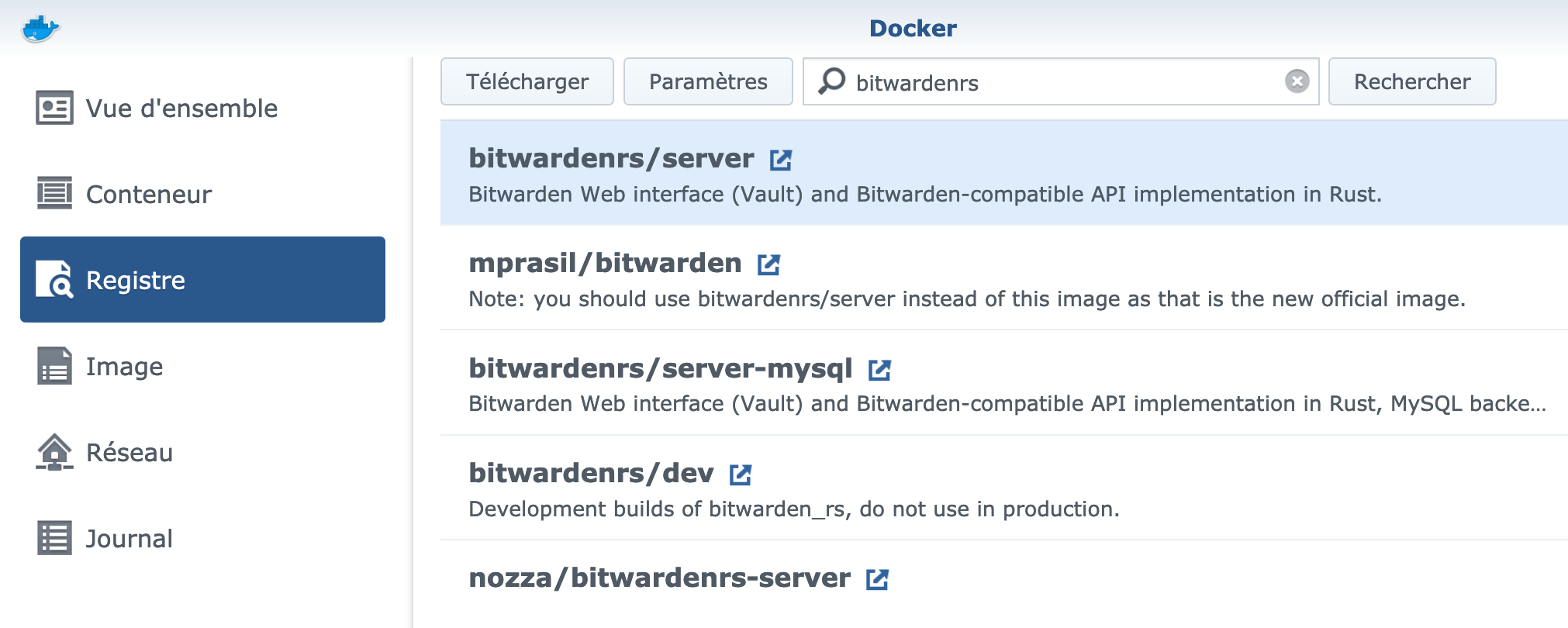 Pour couvrir ce besoin, le mode default bridge de Docker est suffisant : la sortie sur internet est directement active, et le bridge agit comme une sorte de NAT permettant d’attribuer un port de l’hôte (à définir soi-même) avec le port 80 de l’interface de Bitwarden. Seule difficulté rencontrée : le serveur DNS utilisé par l’application est le même que celui fourni par le DHCP du réseau, et ceci ne permet pas d’adresser l’IP de l’hôte lui-même.