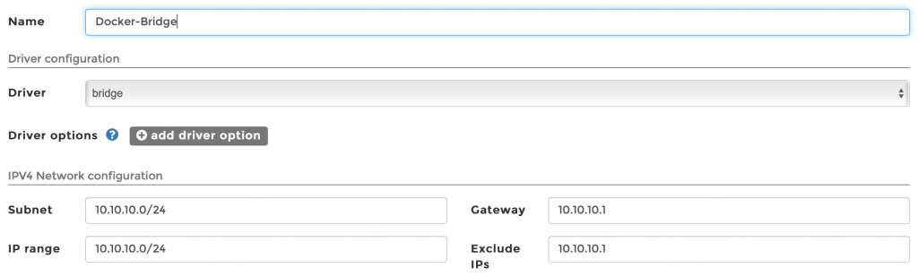 La solution que j’ai identifiée est d’utiliser un user-defined bridge, le default bridge étant naturellement trop limité – et avec le recul, je pense que c’est voulu, afin de pousser les admins à utiliser d’autres modes plus sécurisés. Globalement, un user-defined bridge fonctionne de la même façon que le default bridge, mais on lui associe un réseau de son choix : j’ai opté pour 10.10.10.0/24, avec une passerelle en 10.10.10.1.